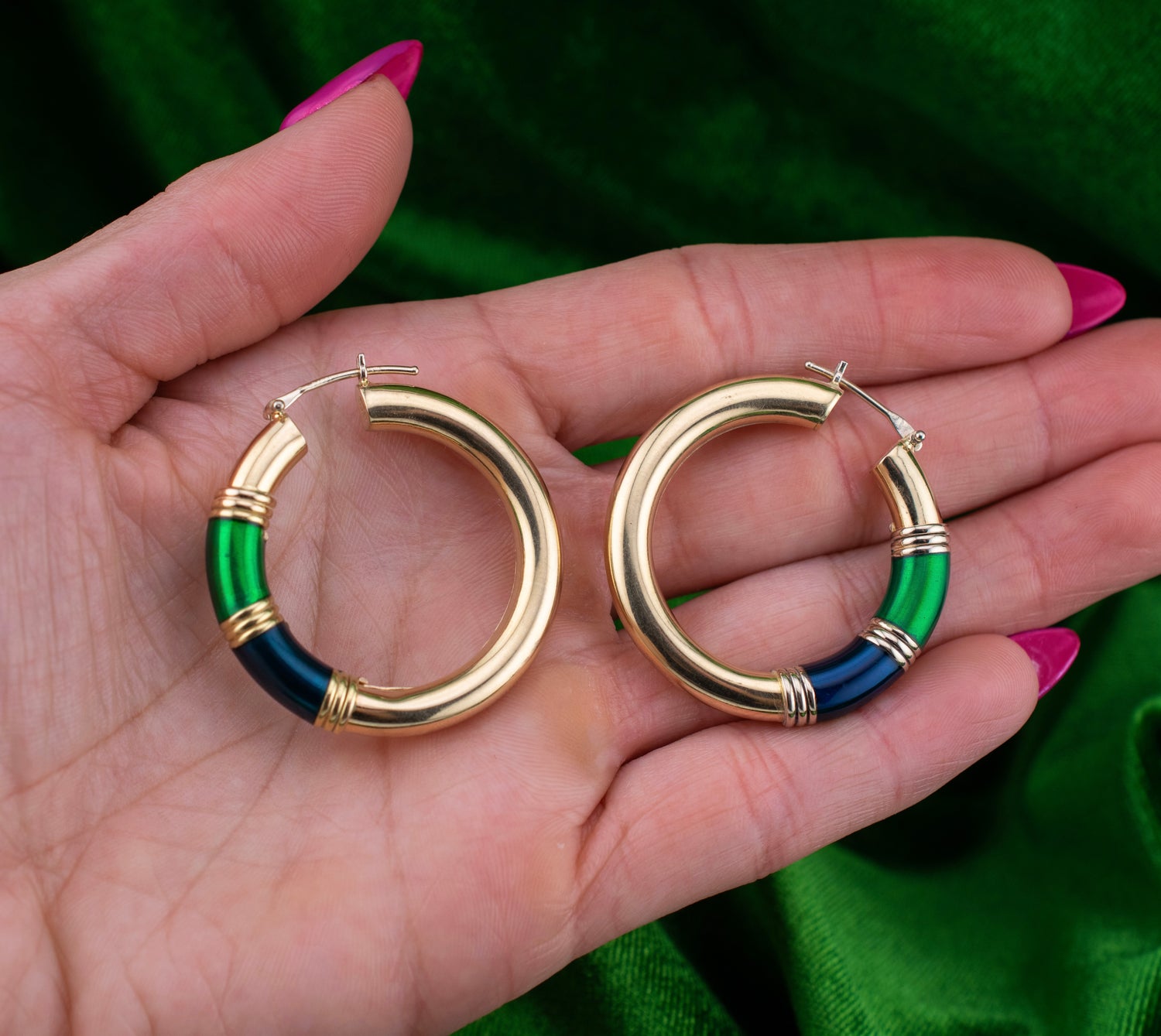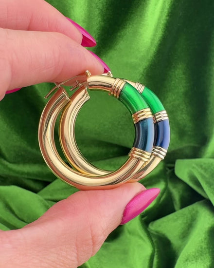 These vintage Italian 14K yellow gold hoops feature an eye-catching combination of emerald green and deep navy enamel, giving them a colorful edge that still feels effortlessly chic. The glossy enamel bands are framed by polished gold rings, creating a distinct contrast that reflects the playful luxury of late 1990s to early 2000s Italian design.