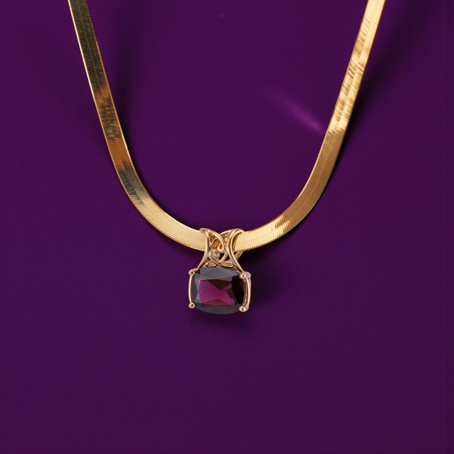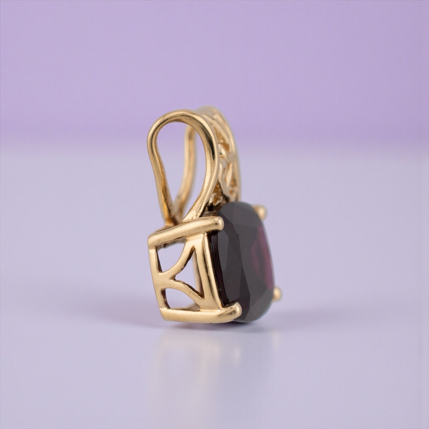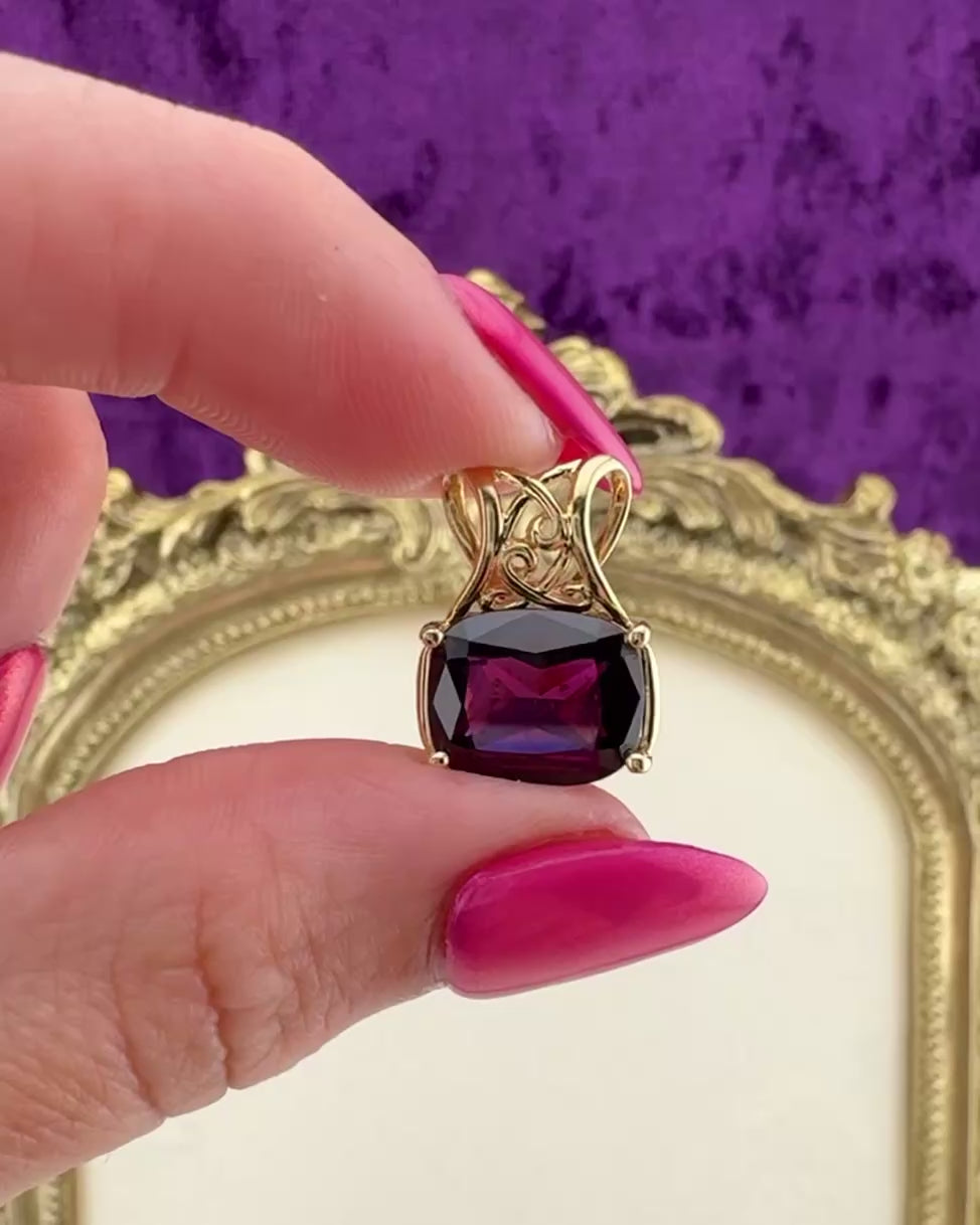 This circa 1990s vintage 14K yellow gold slide pendant brings a touch of rich color to any fine jewelry collection. At its center glows a rectangular cushion-cut rhodolite garnet with a deep raspberry hue, velvety, and absolutely mesmerizing at approximately 11.25 carats. Natural inclusions within the gem highlight its unique character and authenticity. The stone sits in a detailed openwork setting with graceful scroll accents and a wide slide bail that fits beautifully on an omega chain or thicker gold collar.